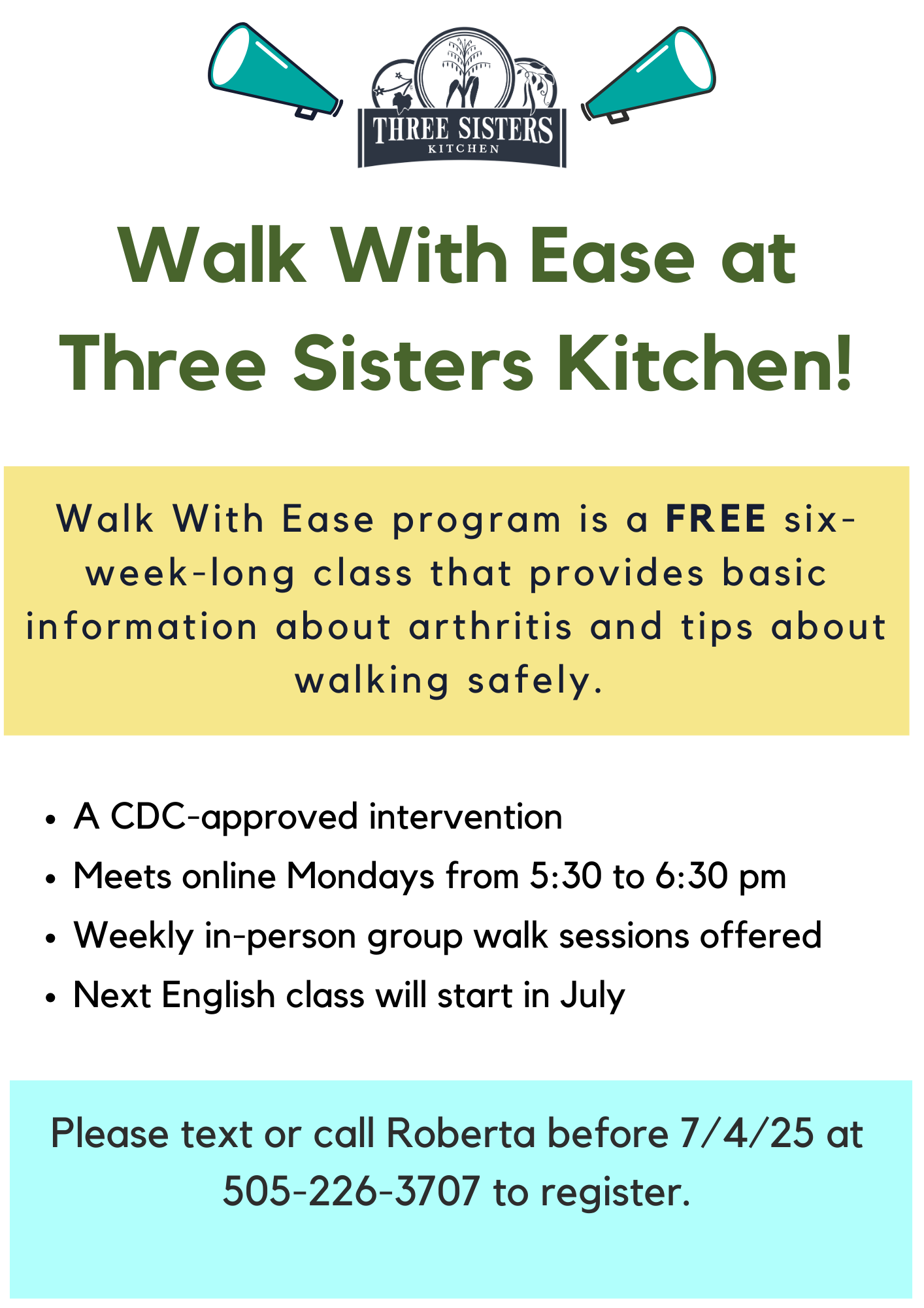 Keep moving or start your first walking plan with one of the Community Health Programs at Three Sisters Kitchen! We will be starting a new Spanish cohort for Walk With Ease April 29th. It’s a FREE 6-week program with tips on how to walk comfortably, even with arthritis. Whether you would like to take the class in English or Spanish, text 505-226-3707 with your name and email address. The classes are online on Mondays 5:30-6:30 pm and the group decides when and where to walk together once a week.