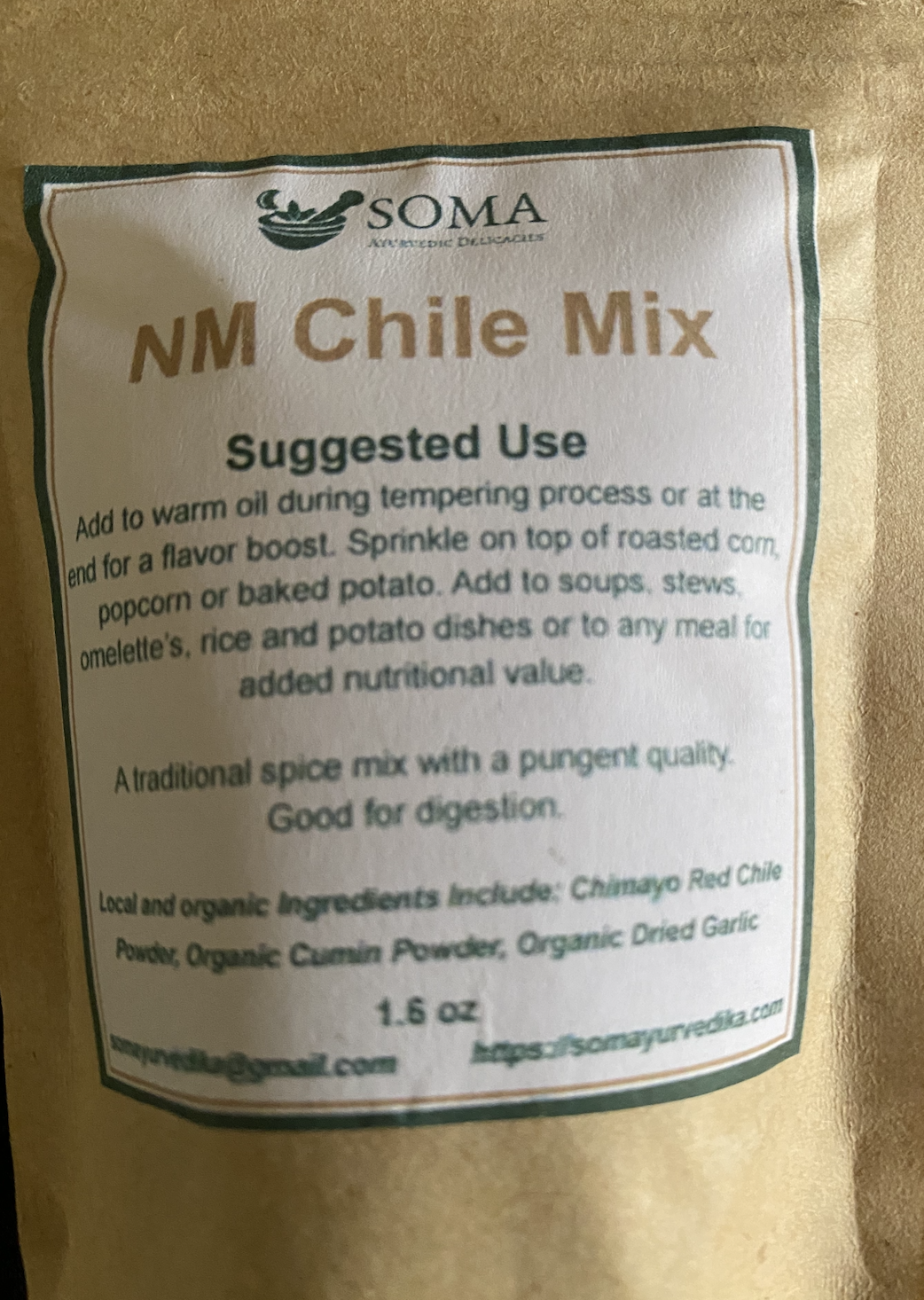 The NM Spice Mix is a unique blend of organic herbs and spices like Chimayo Red Chile powder and herbs that are used in traditional New Mexico cooking. It has a spicy, pungent, and savory quality to it with a myriad of uses. It can be used on roasted corn, popcorn, or baked potato. Add to soups, stews, omelets, rice and potato dishes or to any meal for added nutritional value.
