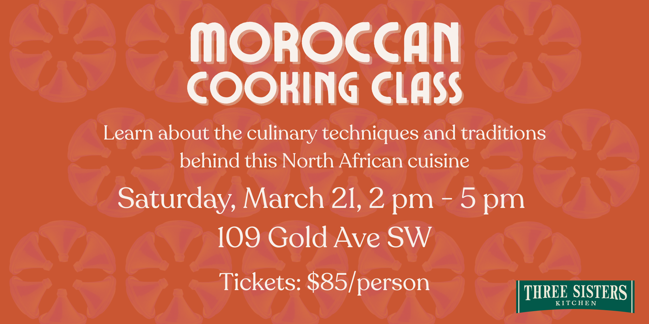 Join us for a hands-on cooking class and learn how to make 3 different Moroccan dishes from scratch, including spice blends and traditional cooking techniques. Tickets are $85, and sliding scale is available. Please reach out to [email protected] for inquiries.