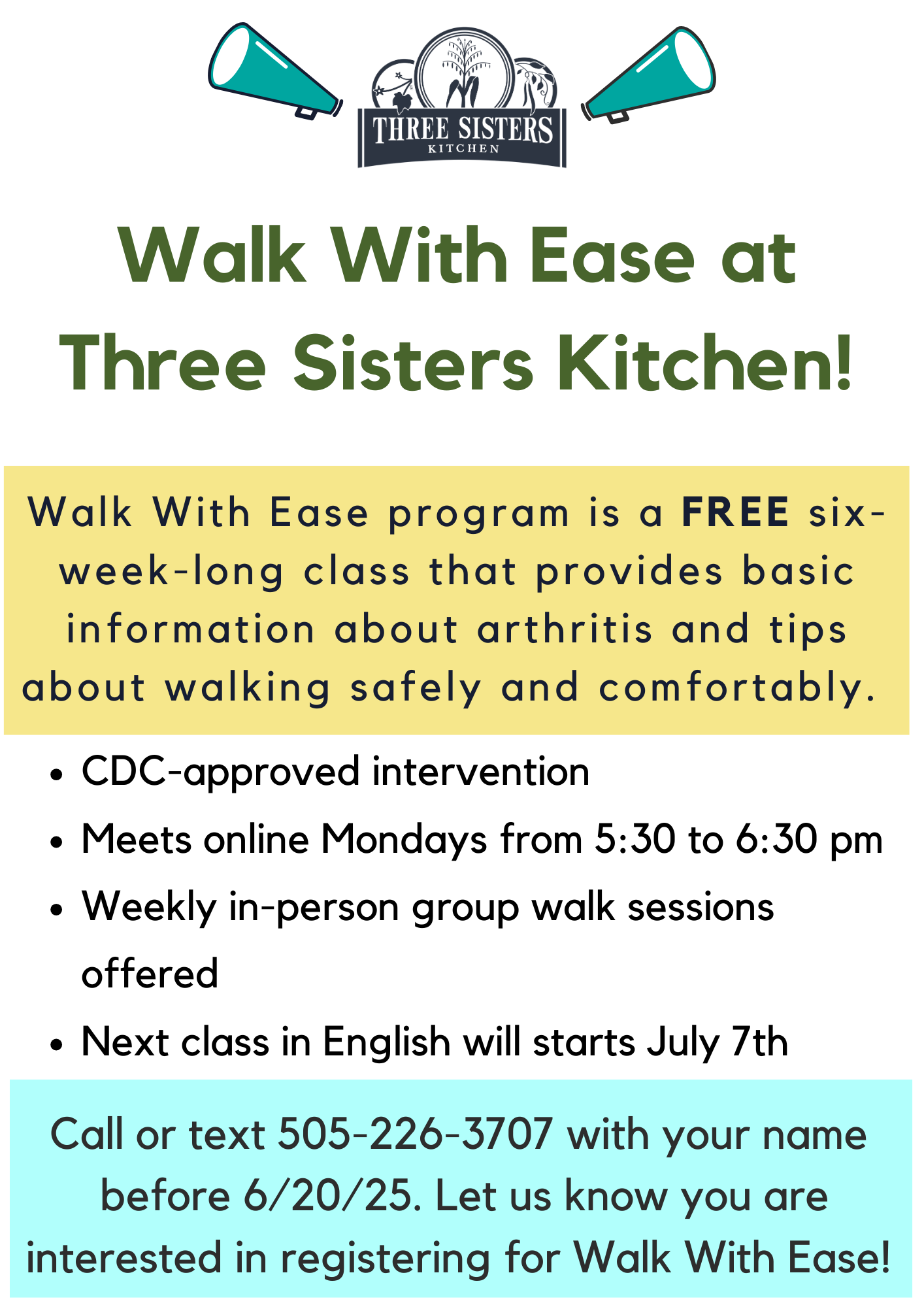 Call or text 505-226-3707 and say you are interested in Walk With Ease