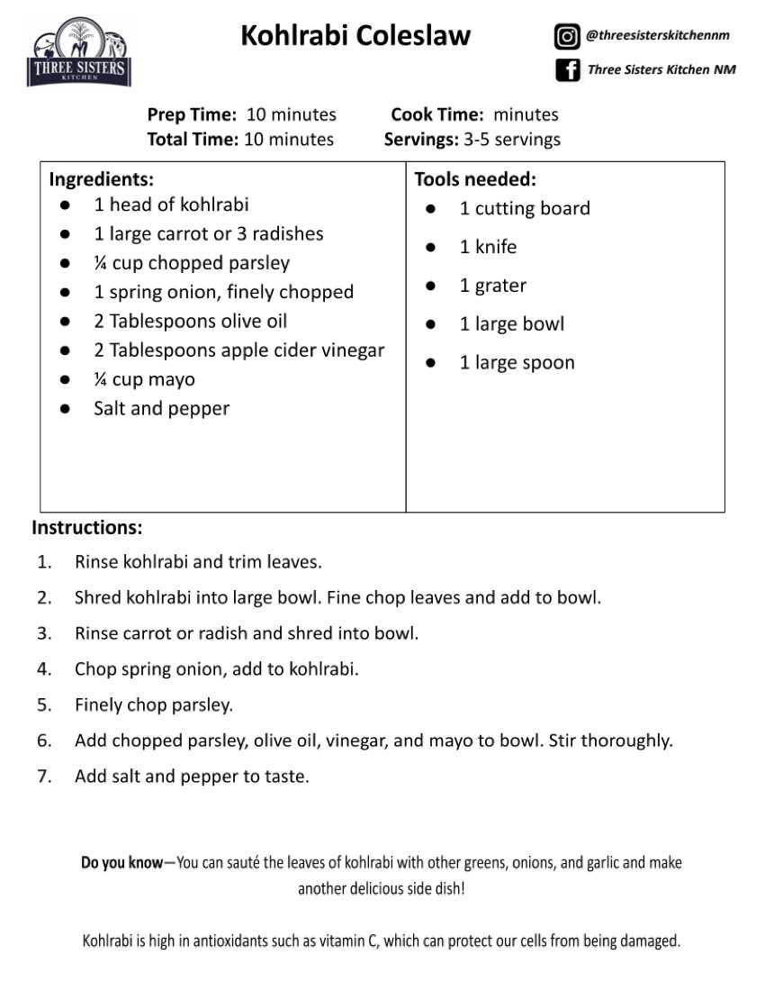 Kohlrabi is a cruciferous vegetable in the same family as broccoli, cauliflower, Brussels sprouts, mustard greens, collards, and kale. It can be eaten raw or cooked and is great for salad or coleslaw. It tastes like broccoli but is a bit sweeter and crunchier.