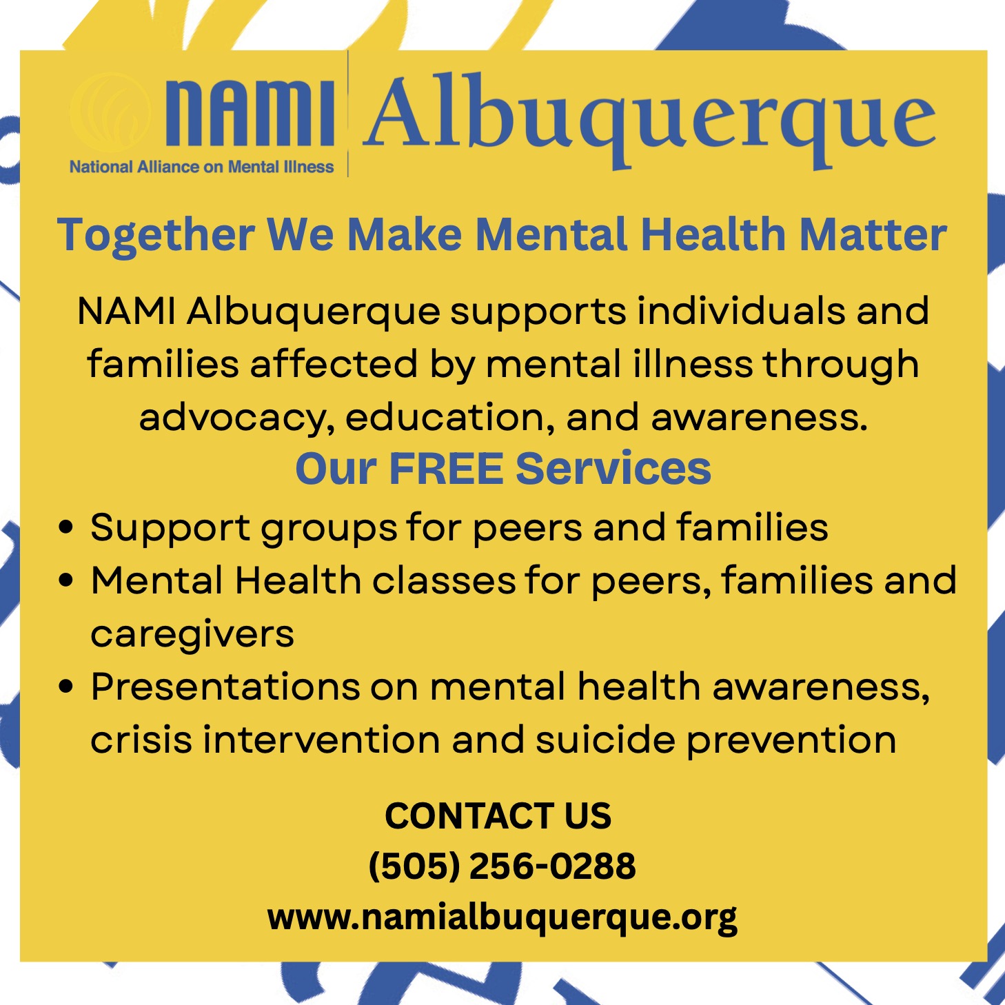 NAMI Albuquerque offers free services for individuals and families affected by mental illness. There are support groups for peers, families and caregivers. Education on mental health, crisis intervention and suicide prevention. www.namialbuquerque.org or contact them at 505-256-0288.
