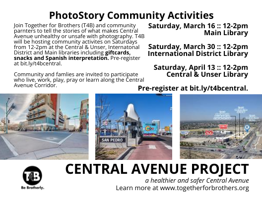 Join Together for Brothers (T4B) for a series of events at local libraries where community members will have an opportunity to visually share stories about their experiences along Central Ave. in Albuquerque.
