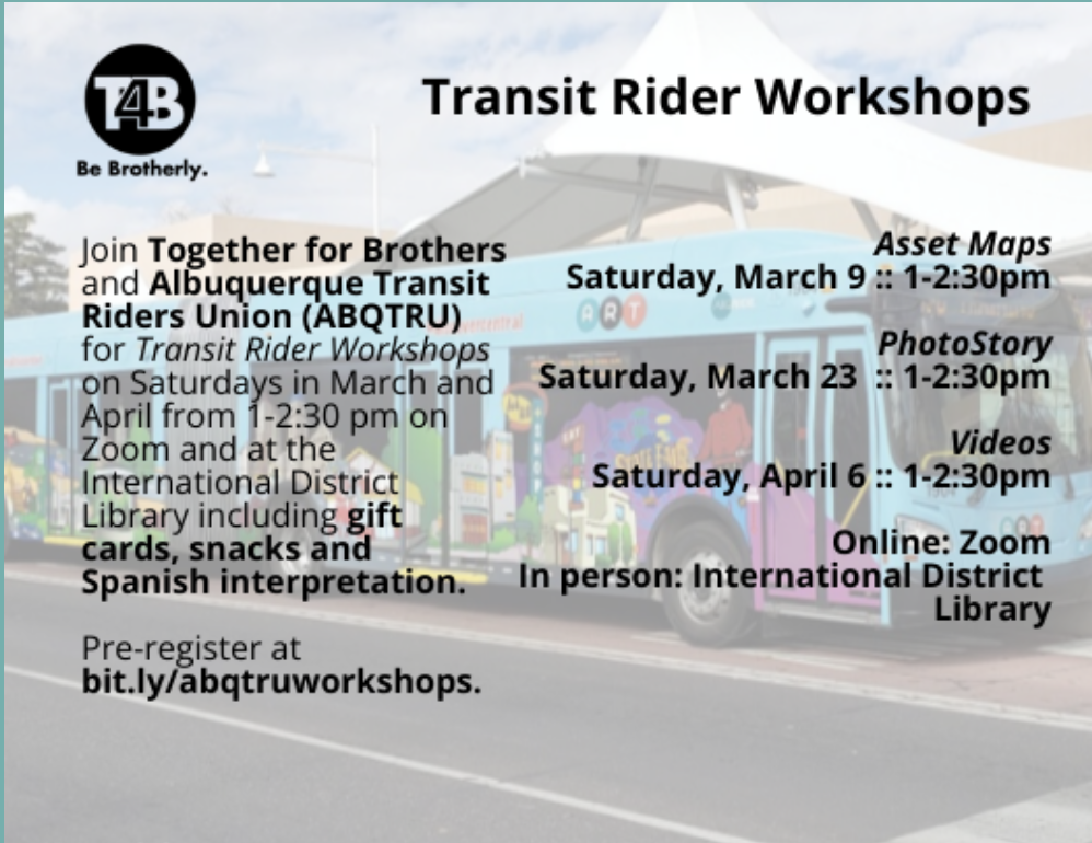 Join Together for Brothers and Albuquerque Transit Riders Union (ABQTRU) for Transit Rider Workshops on Saturdays in March and April from 1:00-2:30pm at the International District Library including gift cards, snacks and Spanish interpretation.