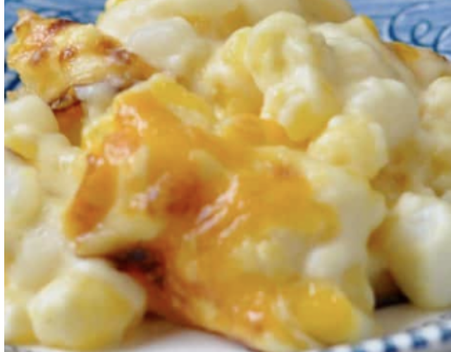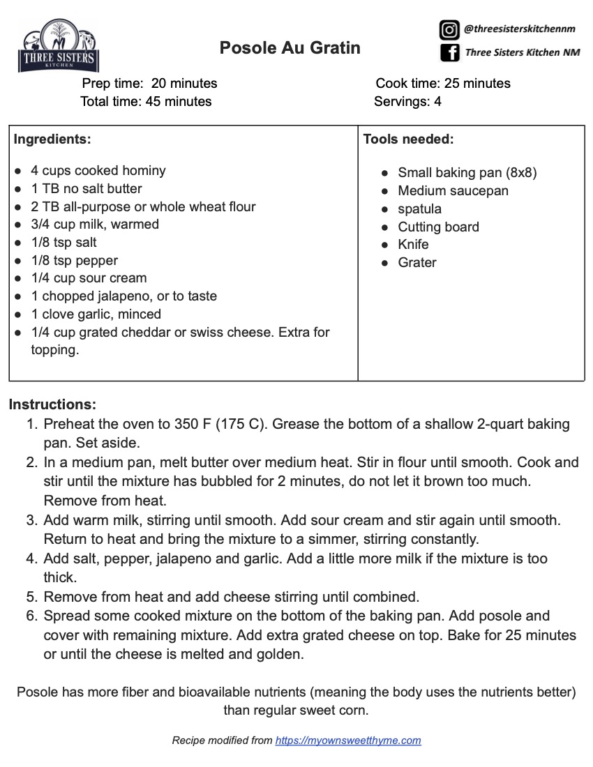 This Posole Au Gratin is creamy comfort in a dish. This silky texture and rich, cheesy flavor provides a sense of solace and contentment. It is high in calcium and fiber.