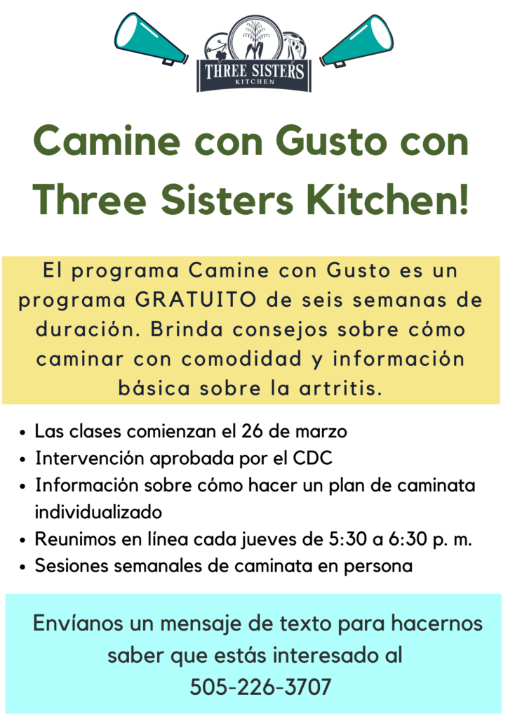 Three Sisters Kitchen ofrecerá un programa de caminatas de 6 semanas. El primero será en español del 26 de marzo al 2 de abril y el segundo, en inglés, del 14 de mayo al 18 de junio. Las clases serán en línea los jueves de 5:30 a 6:30 y el grupo decidirá cuándo caminar en persona.