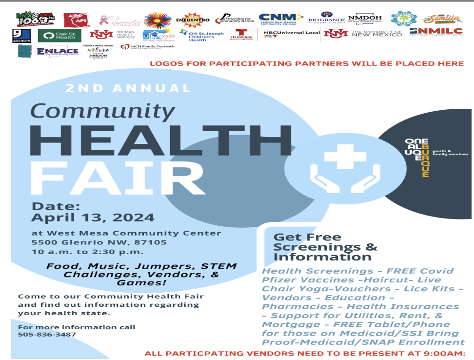 Come and join for the 2nd annual Community Health Fair and find out information regarding your health state. There will be free screenings and health information offered for vaccines, chair yoga, health insurances, utilities, rent, mortgage, free electronic devices, etc.