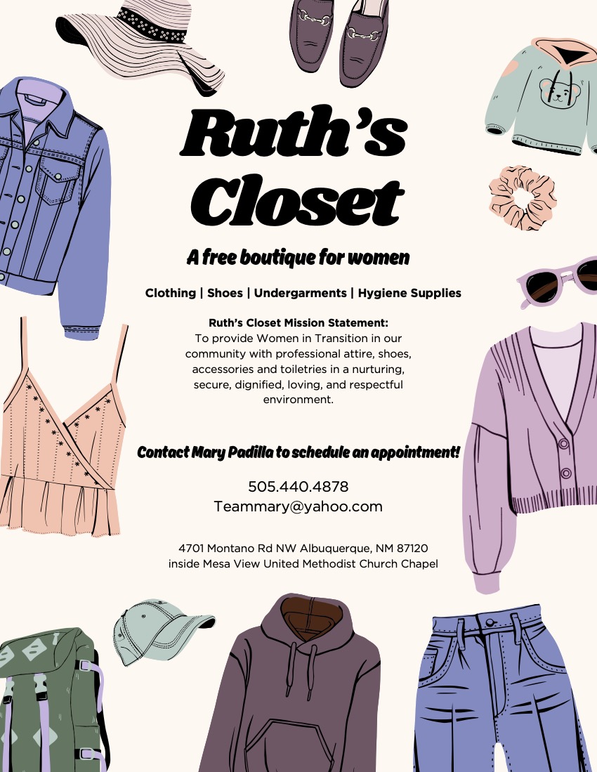 Ruth’s Closet is a clothing Boutique inside of Mesa View United Methodist worship center located on the Westside on the corner of Taylor Ranch Rd and Montano at 4701 Montano.  The boutique provides new and used clothing, handbags and toiletry items to women in need no matter what they are transitioning from–no questions asked.