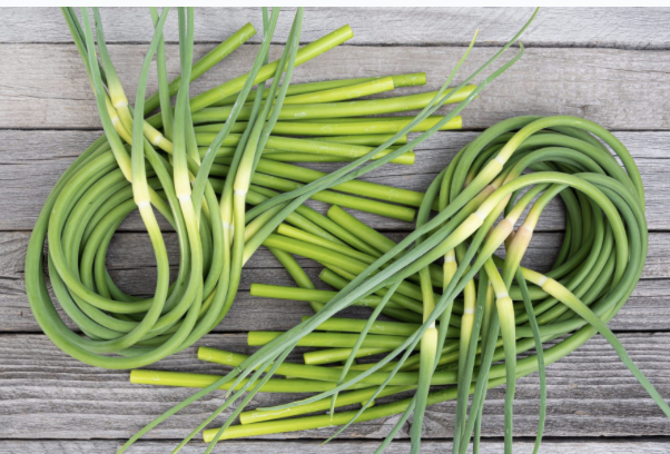 Garlic Scapes are the stalks that grow from the bulbs of hardneck garlic plants. If left unharvested, they will bloom flowers once the garlic plant fully matures. If harvested before they flower, these edible green stalks are a palliative cross between a scallion and a clove of garlic. Garlic scapes are a good source of manganese, vitamin B6, vitamin C, and selenium. They have also been linked to health benefits like lowering cholesterol and blood pressure, boosting the immune system, preventing heart illnesses and various types of cancer.