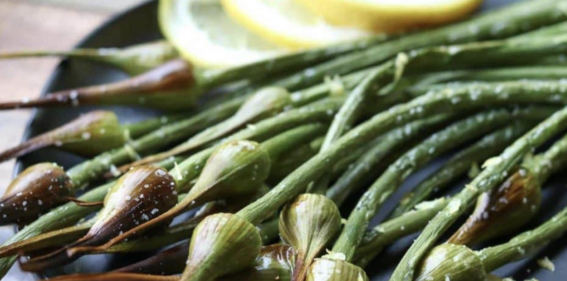 • These Roasted Garlic Scapes recipes are great for summer.  Use garlic scapes like you use asparagus. Sauté them and add them to pastas, salads, as a topping for any protein (chopped and mixed with a little fresh garlic clove), and they are great as a side dish. You can also make a garlic scape pesto out of them. Use them raw in stir fries or roast them! You can only find them in early summer so grab them while you can at your local farmer’s markets.