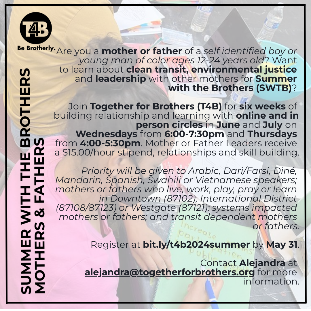 Self- identified boys and young men are welcome to learn about clean transit, environmental justice and leadership with Summer With the Brothers for six weeks, starting in June. Register at bit.ly/t4b2024summer